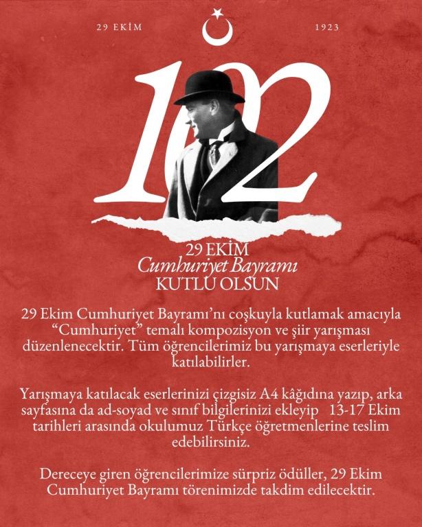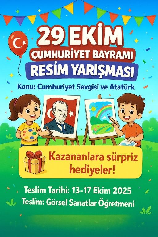 Okulumuzda 29 Ekim Cumhuriyet Bayramı kutlamaları kapsamında resim, şiir ve kompozisyon yarışmaları yapılacaktır. aşağıdaki resimleri tıklayarak ayrıntılı bilgi alabilirsiniz..